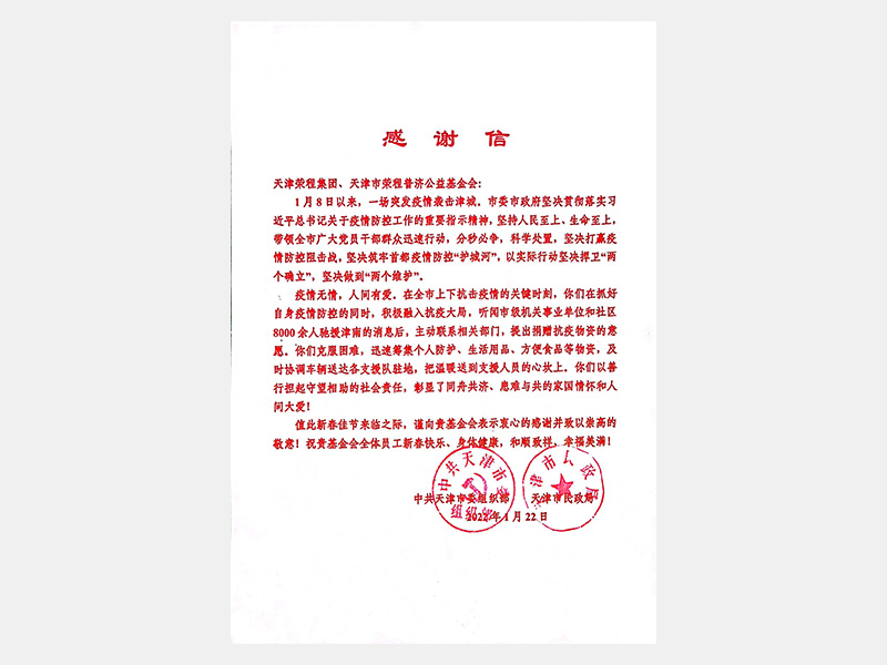 “疫情無情 人間有愛”榮程集團疫情期間善行擔(dān)起守望相助社會責(zé)任感謝信