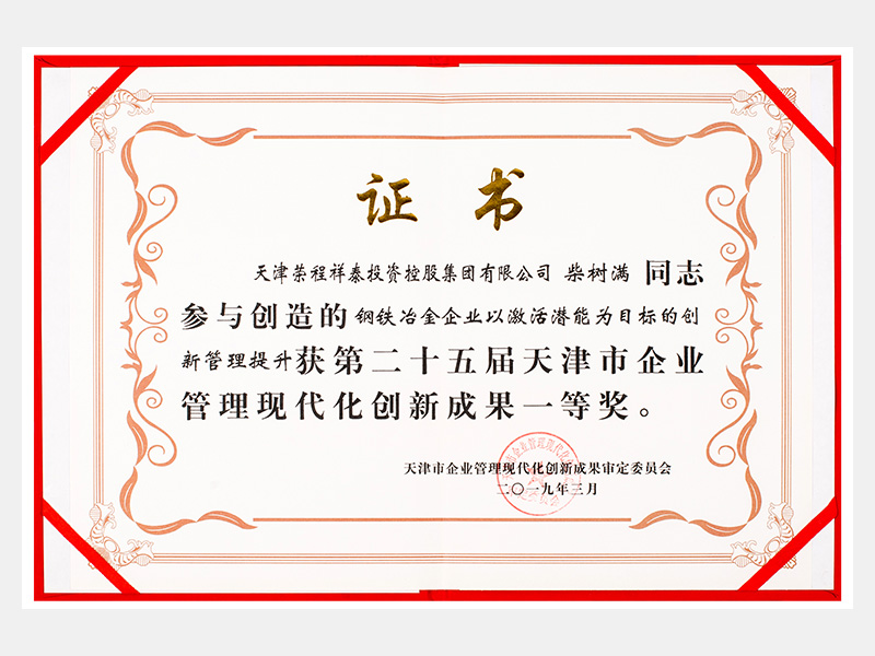 柴樹(shù)滿同志參與創(chuàng)造的鋼鐵冶金企業(yè)以激活潛能為目標(biāo)的創(chuàng)新管理提升獲第二十五屆天津市企業(yè)管理現(xiàn)代化創(chuàng)新成果一等獎(jiǎng)。