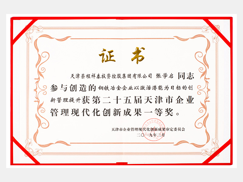張學(xué)啟同志參與創(chuàng)造的鋼鐵冶金企業(yè)以激活潛能為目標(biāo)的創(chuàng)新管理提升獲第二十五屆天津市企業(yè)管理現(xiàn)代化創(chuàng)新成果一等獎。