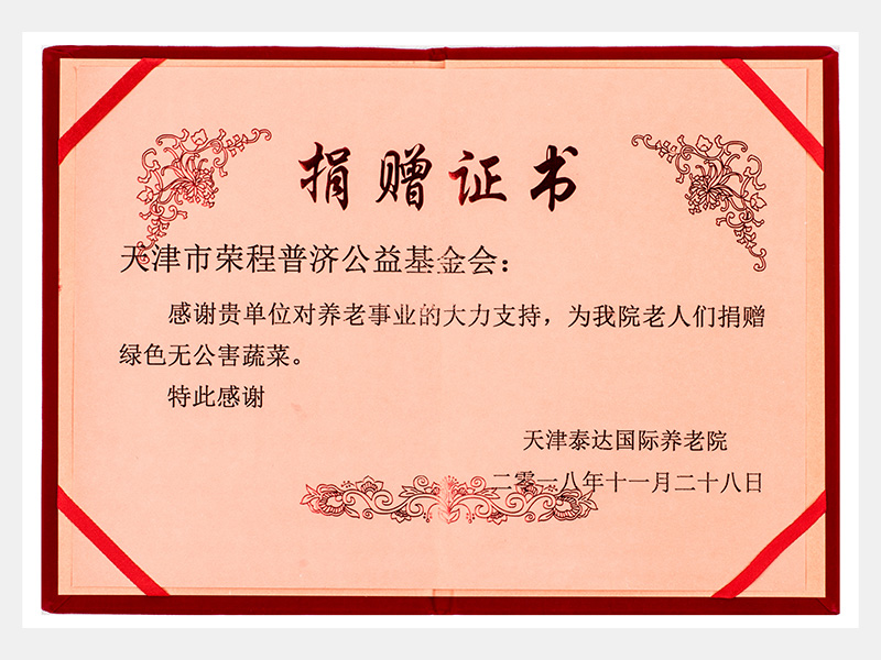 天津泰達(dá)國際養(yǎng)老院感謝捐贈(zèng)證書(慈善)