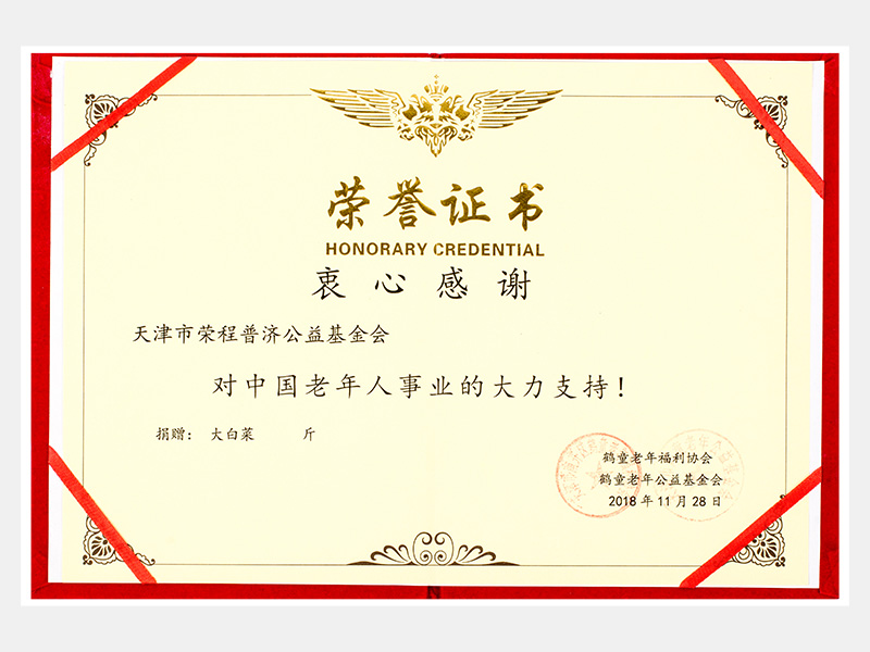 “購滯銷蔬菜捐贈養(yǎng)老院福利院活動”鶴童老年福利協(xié)會榮譽(yù)證書(慈善)