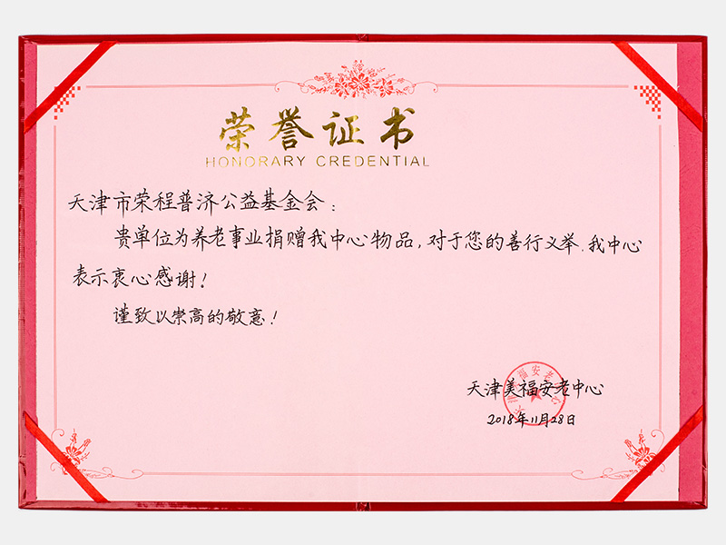 “購滯銷蔬菜捐贈養(yǎng)老院福利院活動”天津美福安老中心榮譽(yù)證書(慈善)